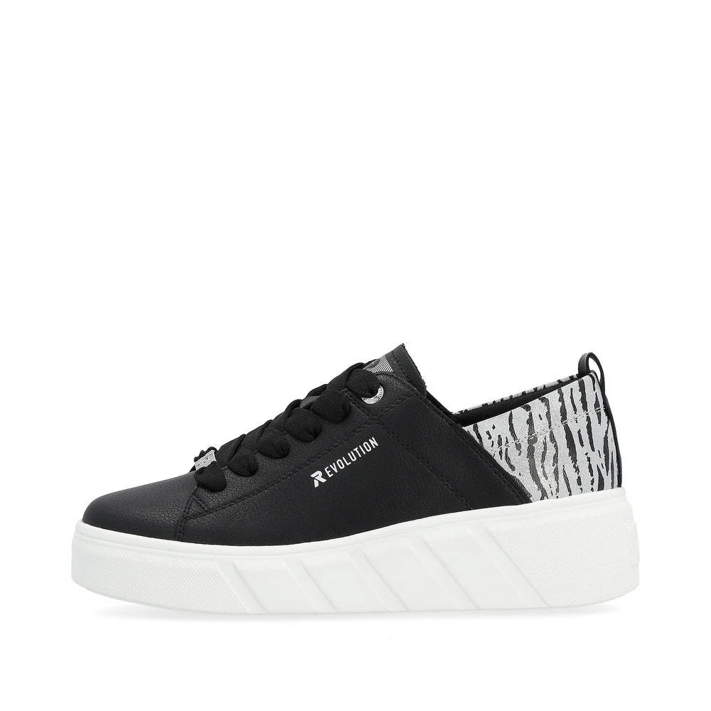 sporty and modern! these black sneakers by rieker evolution made of smooth leather are simple and ingenious. in addition, ideal support and a good fit are guaranteed by the lacing. the shock absorbing and light platform sole additionally pampers the feet with every step. extra soft and removable insole? check! thanks to the light micro suede lining, ideal comfort is guaranteed! party for the feet is on!